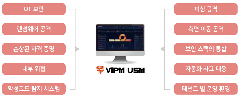 - 보안 사고 대응 시간 단축: VIPM-USM은 감시부터 대응까지의 시간을 단축하여 보안 사고로 인한 피해를 최소화 할 수 있습니다. 자동화 대응 체계로 보안 위협에 대한 확산을 방지하고 신속하게 대응할 수 있습니다.
