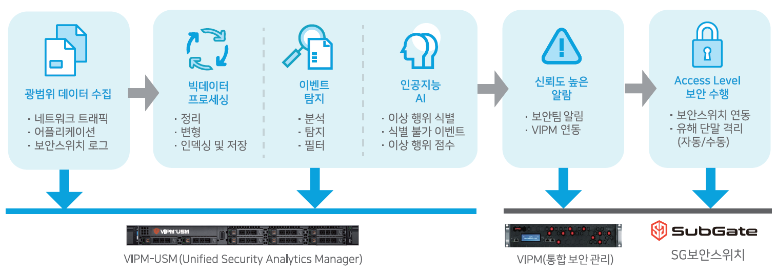 드림넷의 VIPM-USM(Visual IP Manager Unified Security Analytics Management)은 이러한 요구에 부응하는 차세대 AI기반 통합 위협 분석 시스템으로 주목 받고 있습니다.