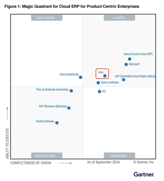 2024년 Gartner가 제품 중심 기업을 위한 클라우드 ERP를 위한 Magic Quadrant 에서 4년 연속으로 Infor를 리더로